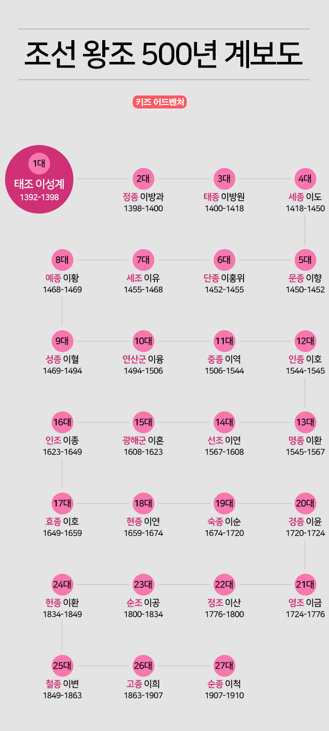 우리나라에서 가장 최근의 과거. 바로 대한민국이 만들어지기 전에 오랫동안 우리나라의 이름으로 불렸던 '조선시대'의 역대 왕에 대한 소개를 하려고 합니다. 오늘은 첫 번째로 약 500년에 걸쳐 조선을 다스렸던 '조선 왕 계보'를 준비했습니다. 조선 왕 계보는 1대 조선 개국 왕인 태조 이성계부터 조선의 마지막 왕이자 나라를 잃고 어머니 명성왕후를 잃은 비극까지 겪어야 했던 27대 순종 이척까지 조선의 역사를 한 번에 볼 수 있는 매우 중요한 자료입니다.