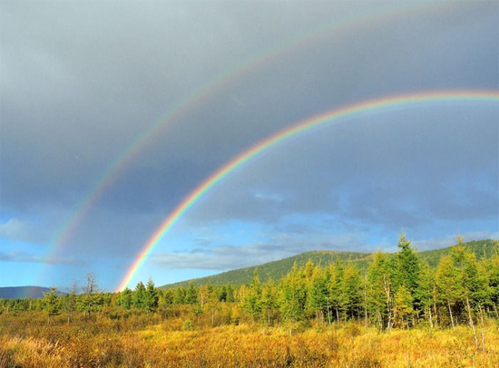 먼저 무지개는 빛의 굴절과 분산의 대표적인 예입니다. 무지개는 햇빛이 공기를 통과하다가 물방울을 만나면 빛이 굴절되고 분산되면 생기는 현상입니다. 햇빛 안에는 서로 다른 성질의 빛이 함께 모여 있습니다. 그중에서 빨간색 계통의 빛은 굴절이 조금만 되고, 파란색 계통의 빛은 굴절이 크게 됩니다. 그래서 햇빛이 물방울을 만나면 그 안의 빛들이 굴절의 크기에 의해 분산이 일어나서 무지개가 되는 것입니다.